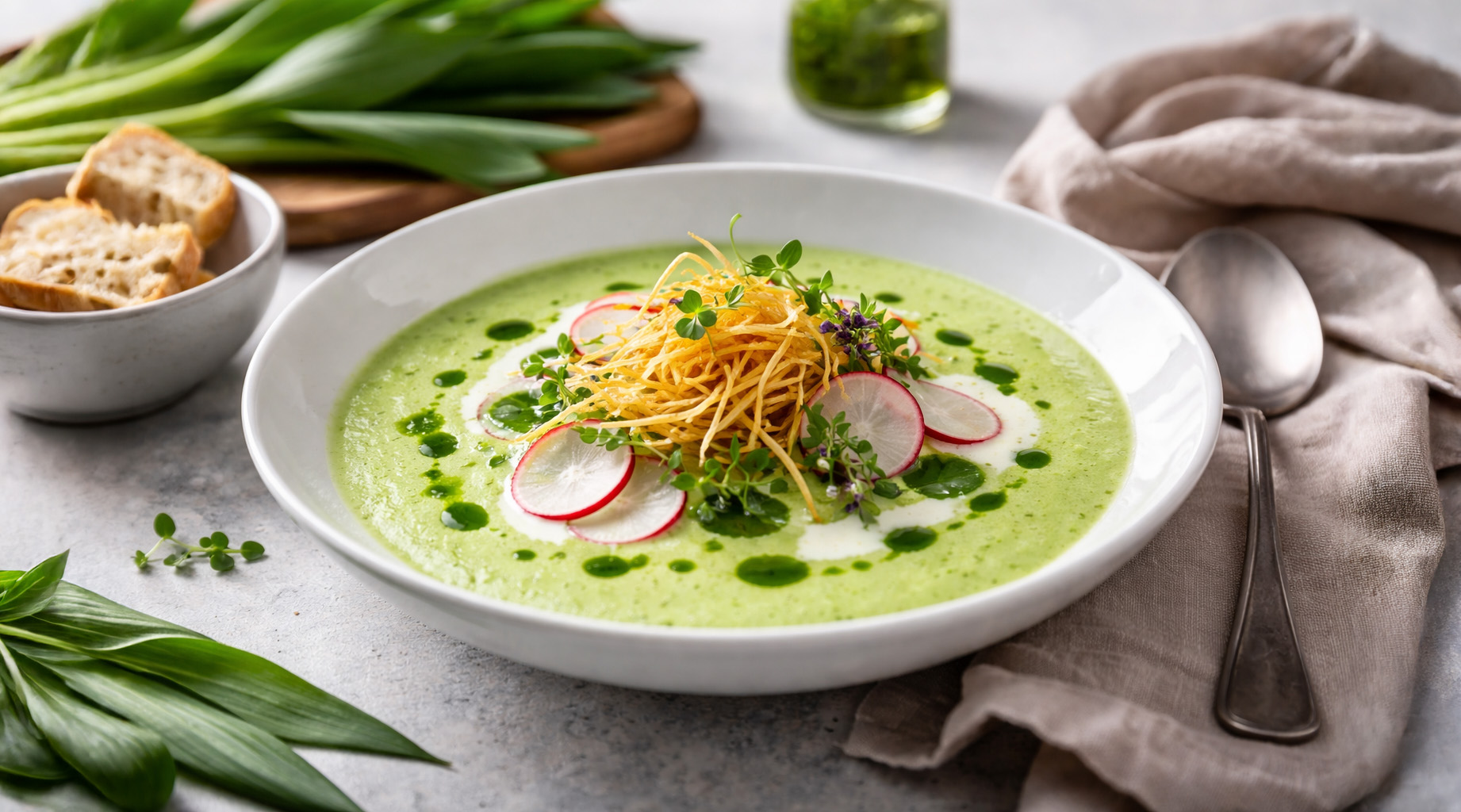 Bärlauch-Schaumsüppchen | Kartoffelstroh | Radieschen-Carpaccio | Kräuteröl