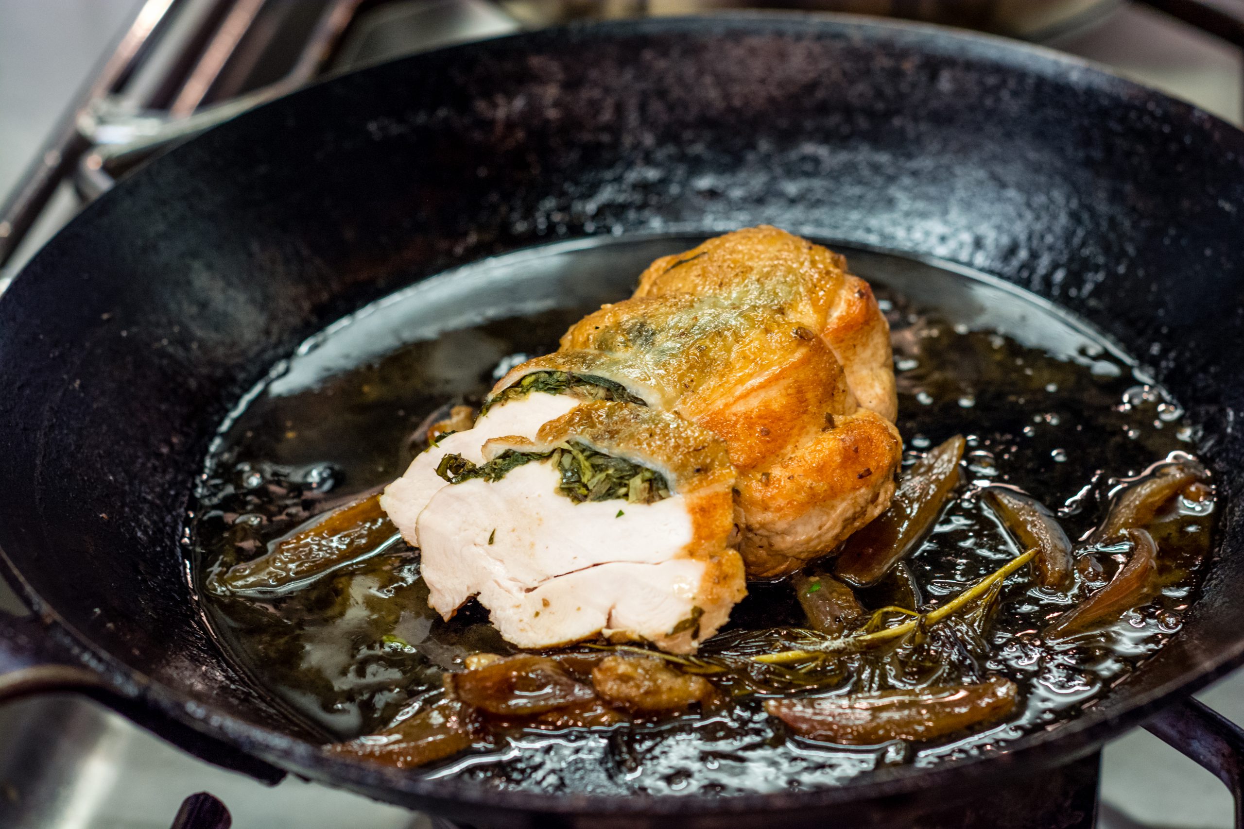 Gefüllte Maishühnchenbrust | Möhrengrün-Pesto | Risotto von geröstetem Buchweizen | Zitronenbutter