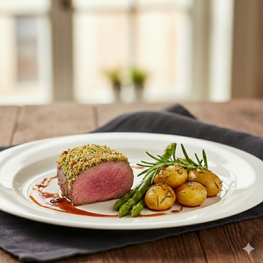 Kalbsrücken mit Kräuterkruste | grüner Pfannen-Spargel | junge Kartoffeln mit Rosmarinbutter sous vide gegart